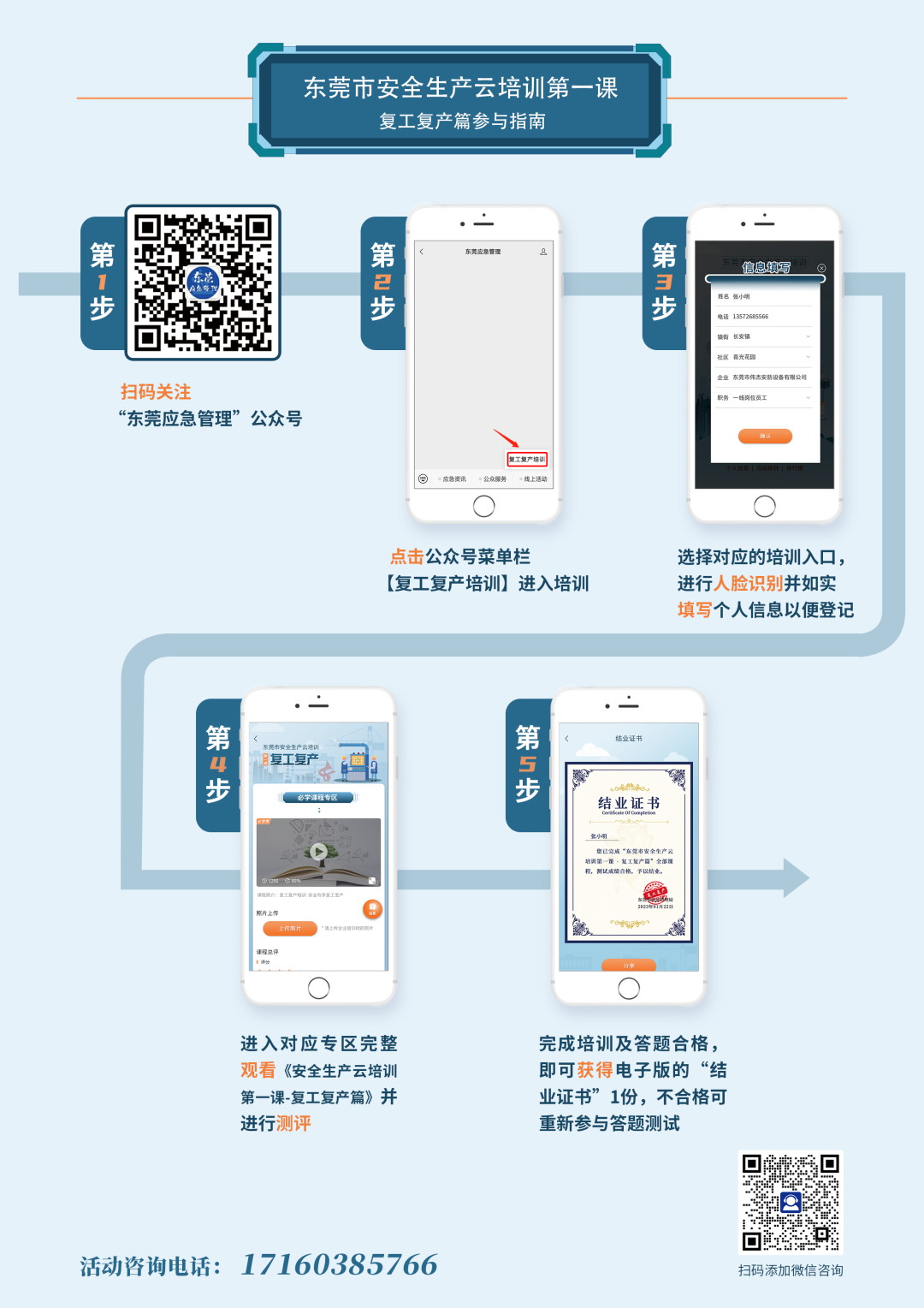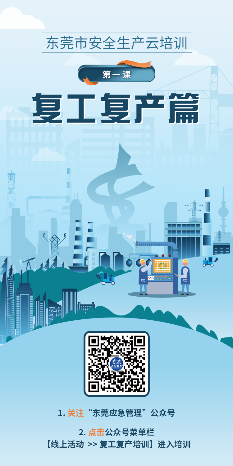 參與指南:關(guān)注“東莞應(yīng)急管理”公眾號(hào),通過(guò)點(diǎn)擊公眾號(hào)菜單欄【線上活動(dòng)→復(fù)工復(fù)產(chǎn)培訓(xùn)】,登記個(gè)人信息,完成注冊(cè)后,點(diǎn)擊“我要參加”進(jìn)入培訓(xùn)內(nèi)容界面,點(diǎn)擊觀看視頻進(jìn)行學(xué)習(xí)。